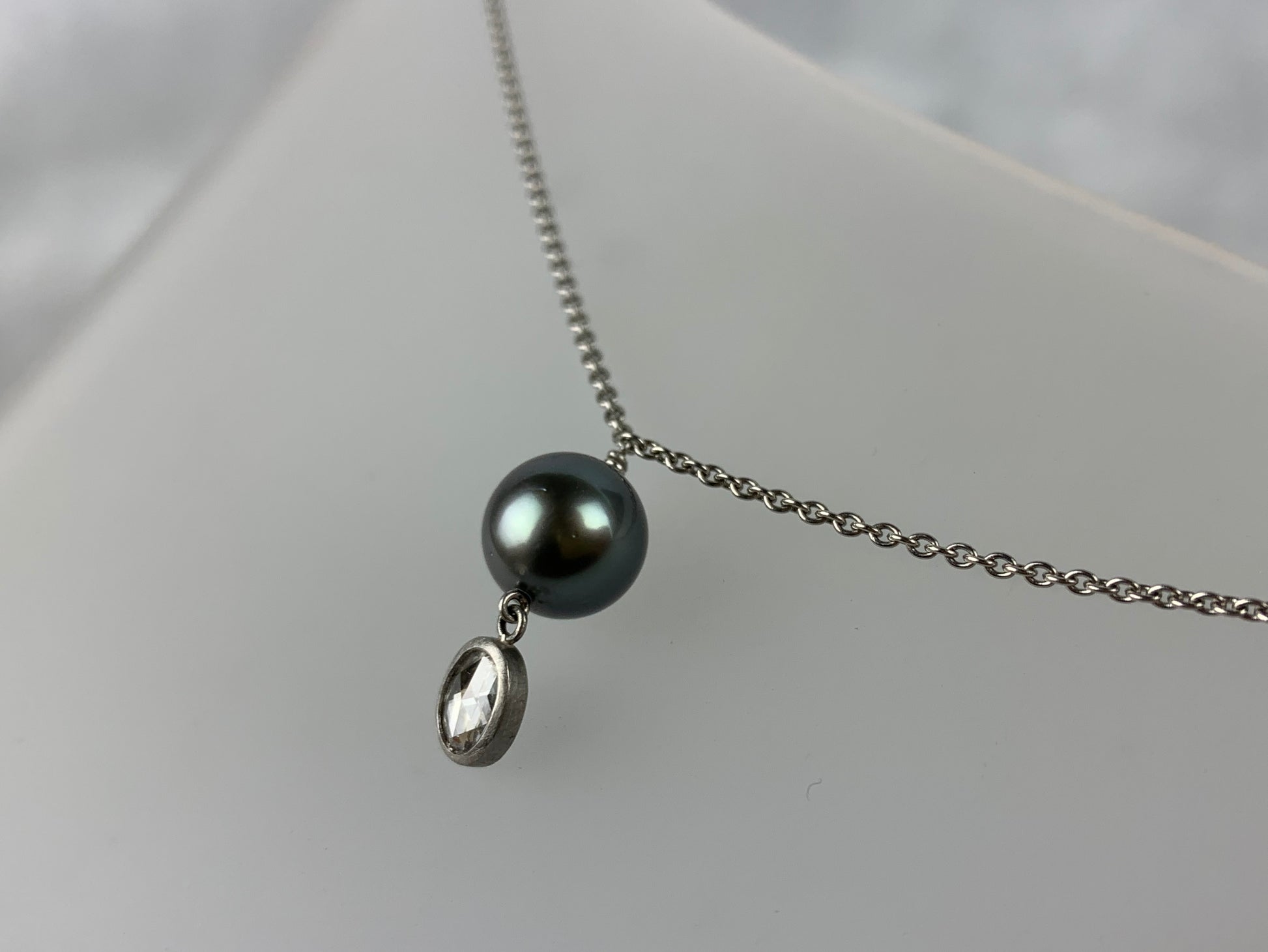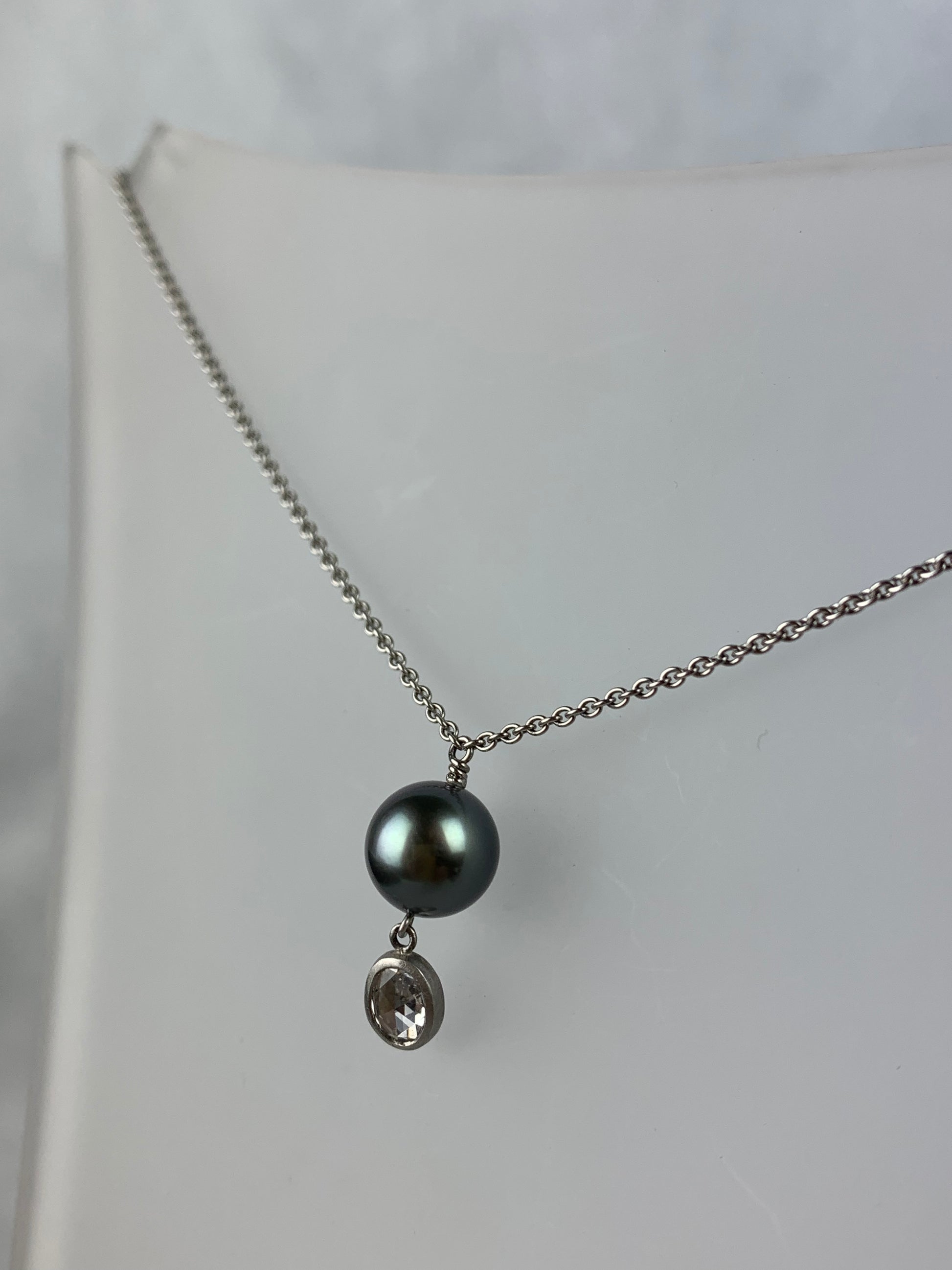 Malcolm Betts' necklace handmade in the UK, with round Tahitian Pearl pendant and oval platinum set rose cut diamond drop on a platinum fine chain.