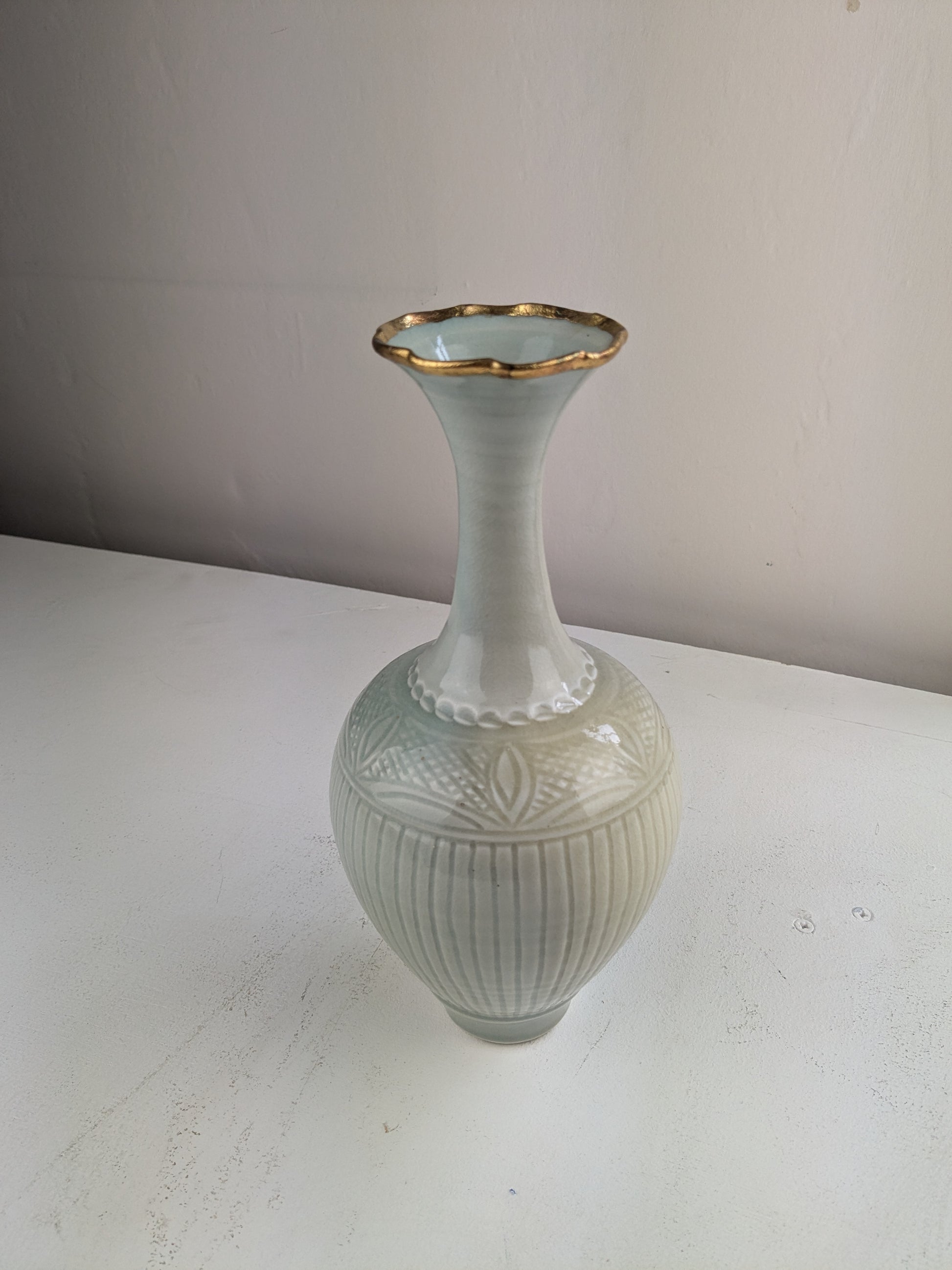 Bridget Drakeford - celadon tall neck vase, curved bottle w gold leaf