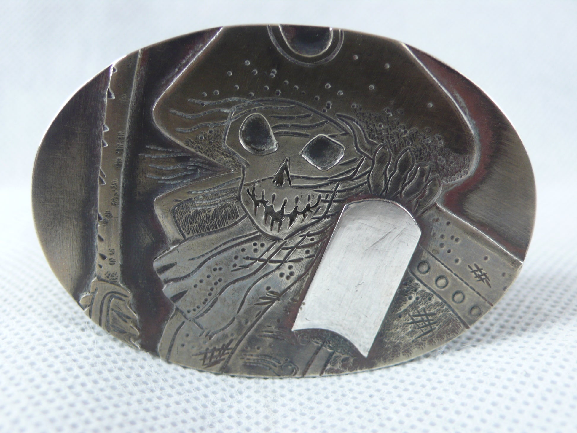 Oval silver tin by C J Van Dop, depicting pirate /ghost and detail, also in silver.
