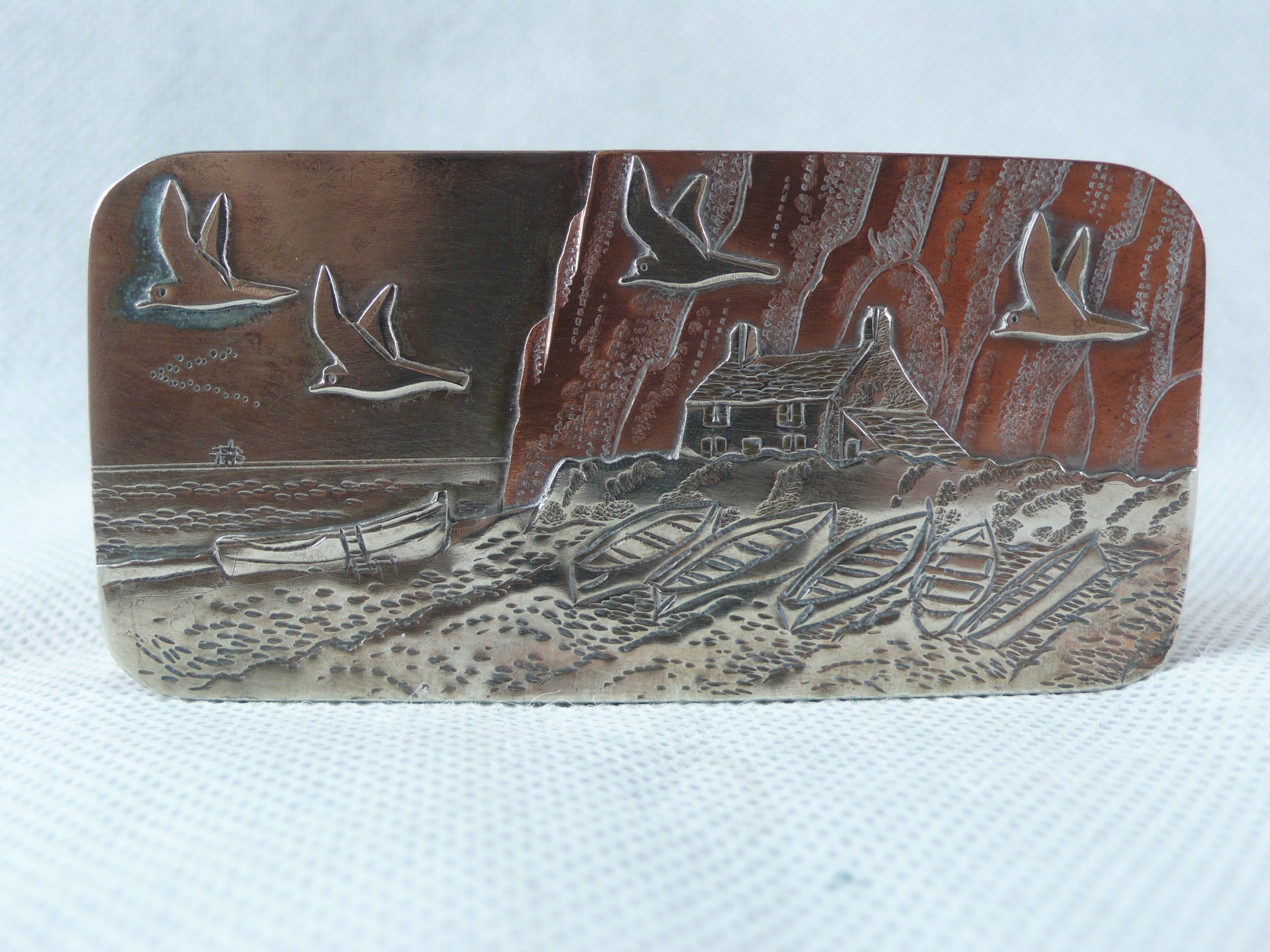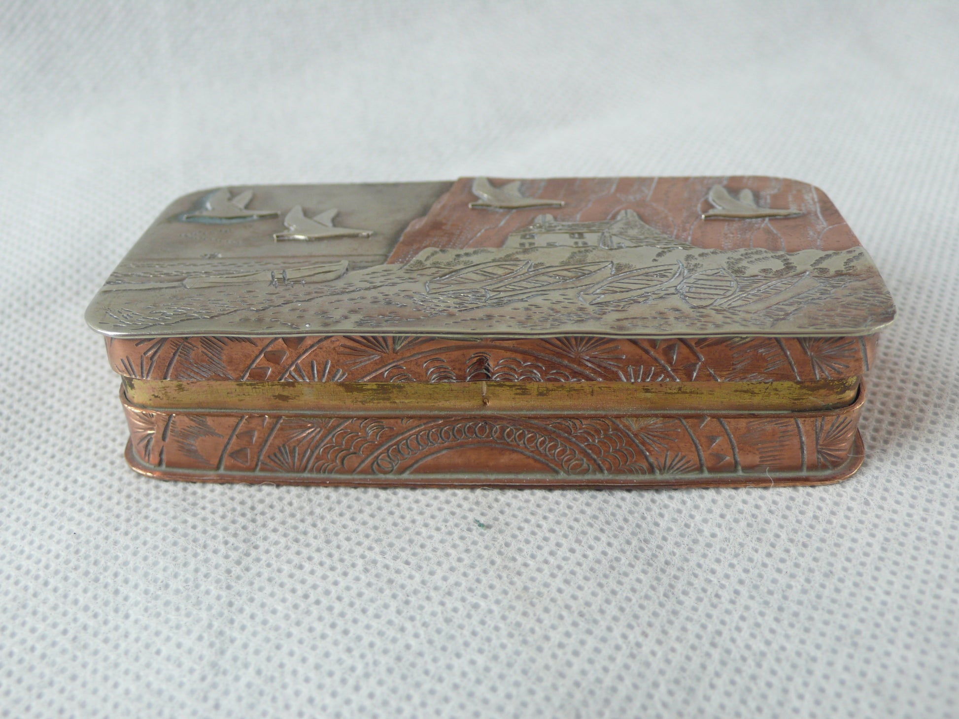 Rectangular tin with rounded corners, copper with silver detail and design.