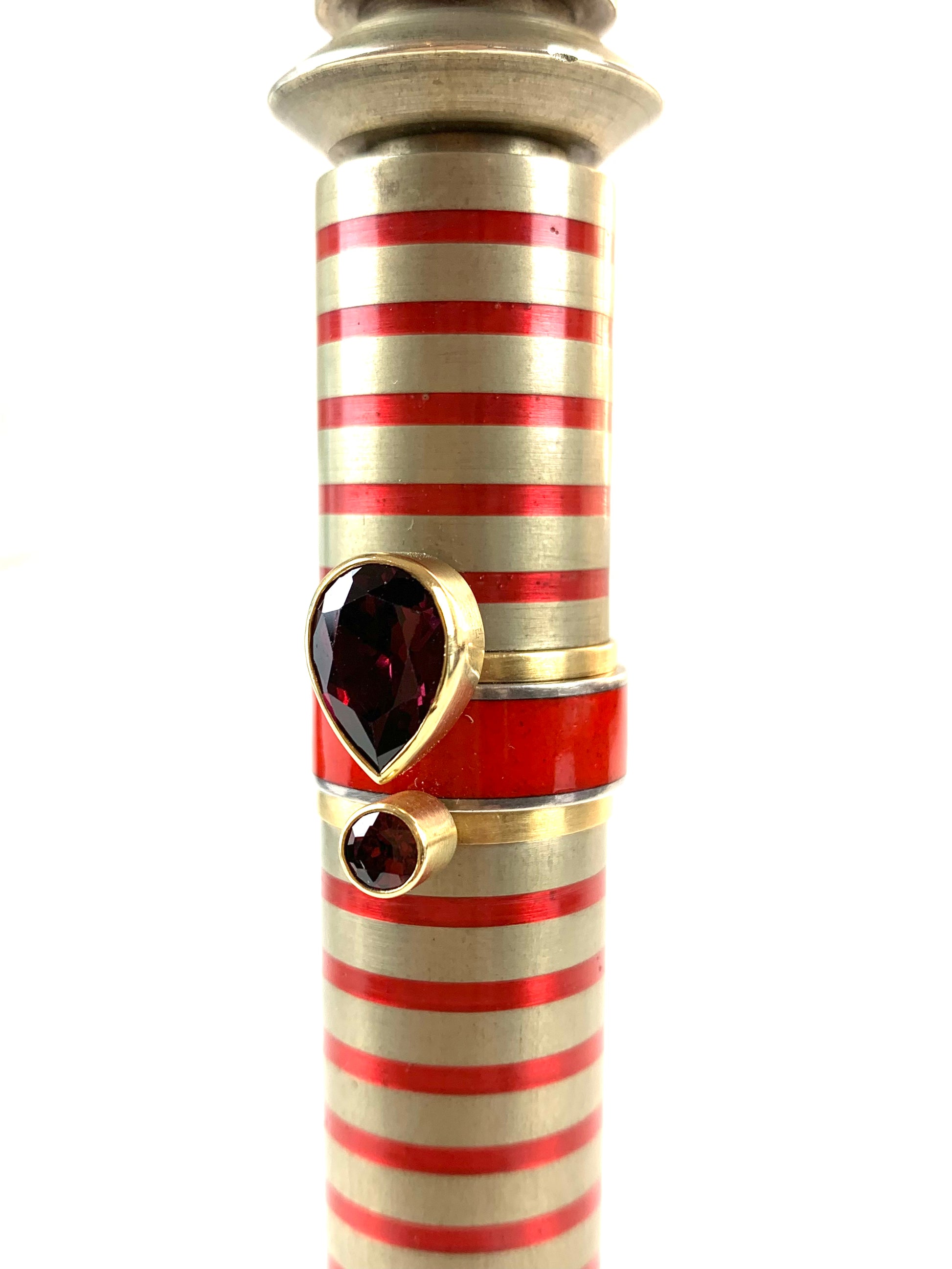 Ring set by Wendy Ramshaw comprised of three rings, two of which are set in 18ct gold with a large teardrop garnet and small circular garnets. The middle ring is enamel on silver.