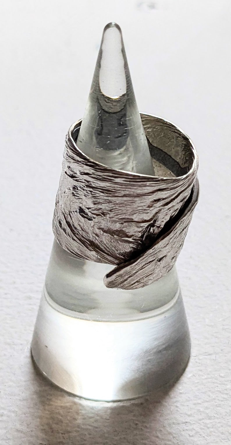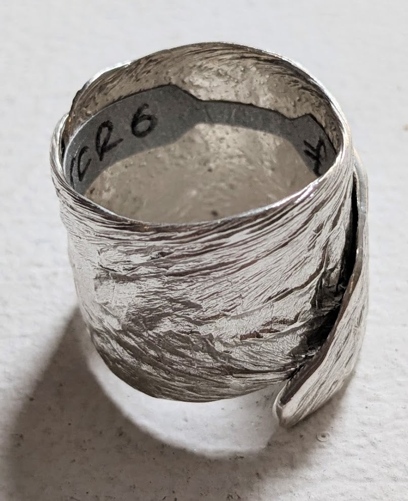 Viriditas adjustable silver ring, wide poured metal by Teresa Crickmar.