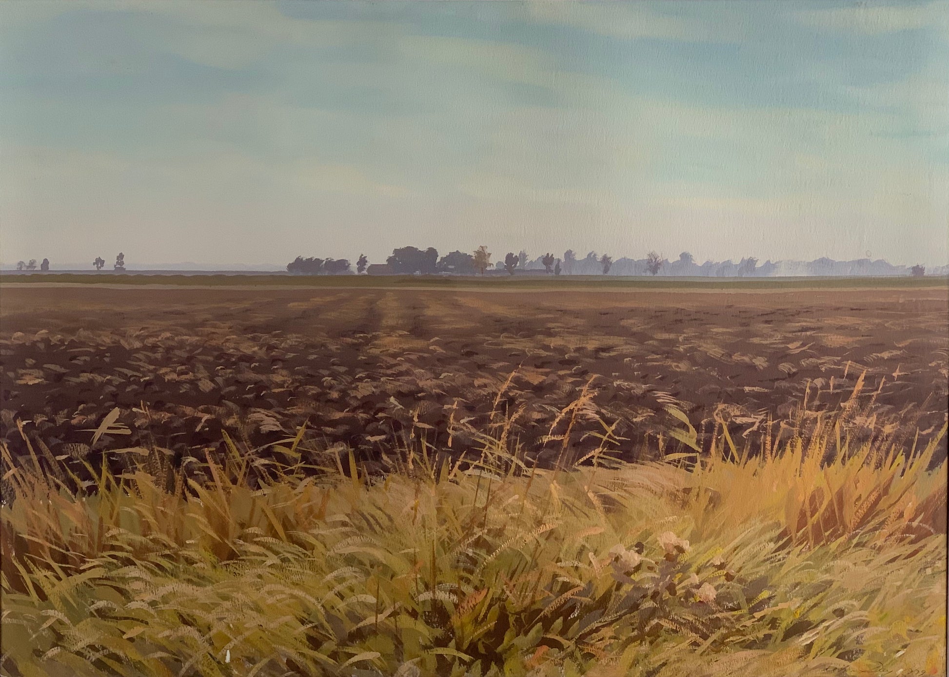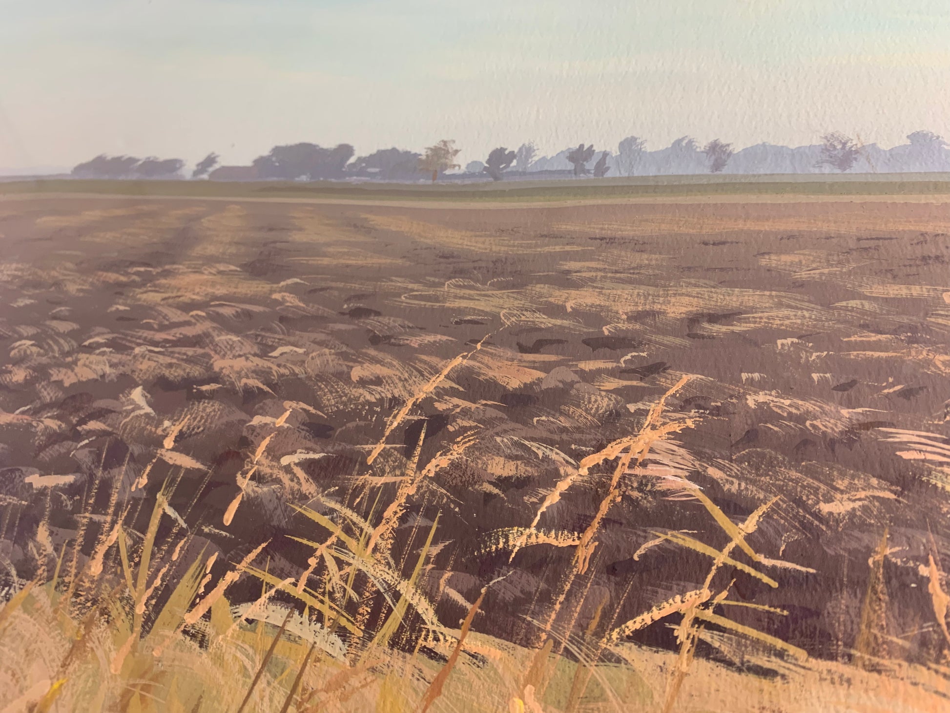 'En plein air' landscape using a palette of subtle colours, predominantly in gouache, entitled 'After Harvest' by Anthony Day.
