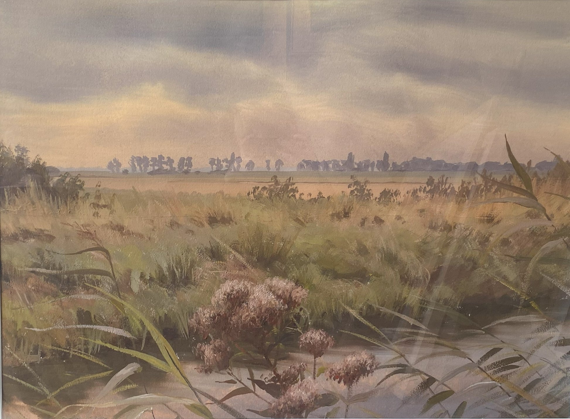 'En plein air' landscape using a palette of subtle colours, predominantly in gouache, entitled 'Autumn Lode' by Anthony Day.