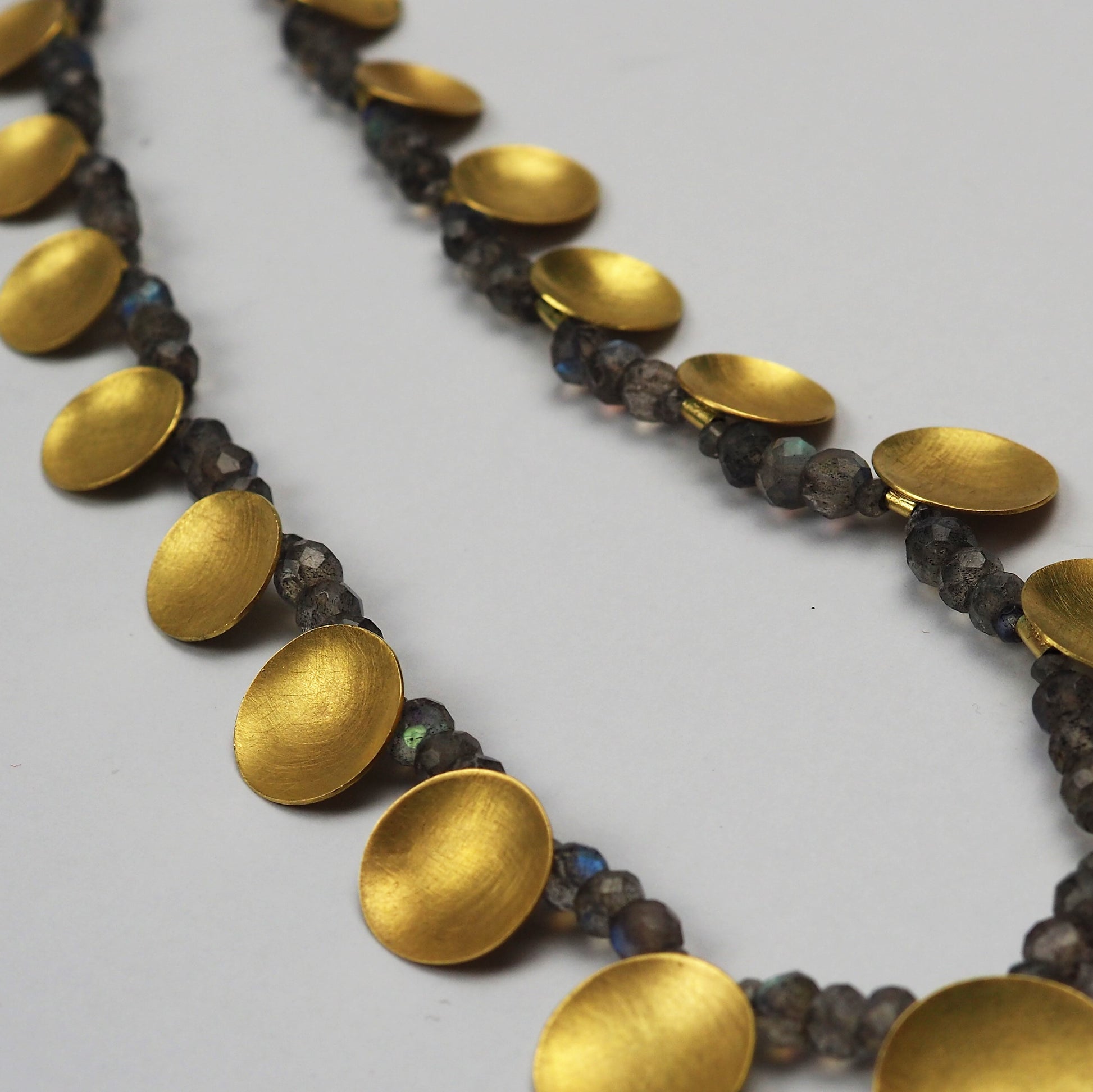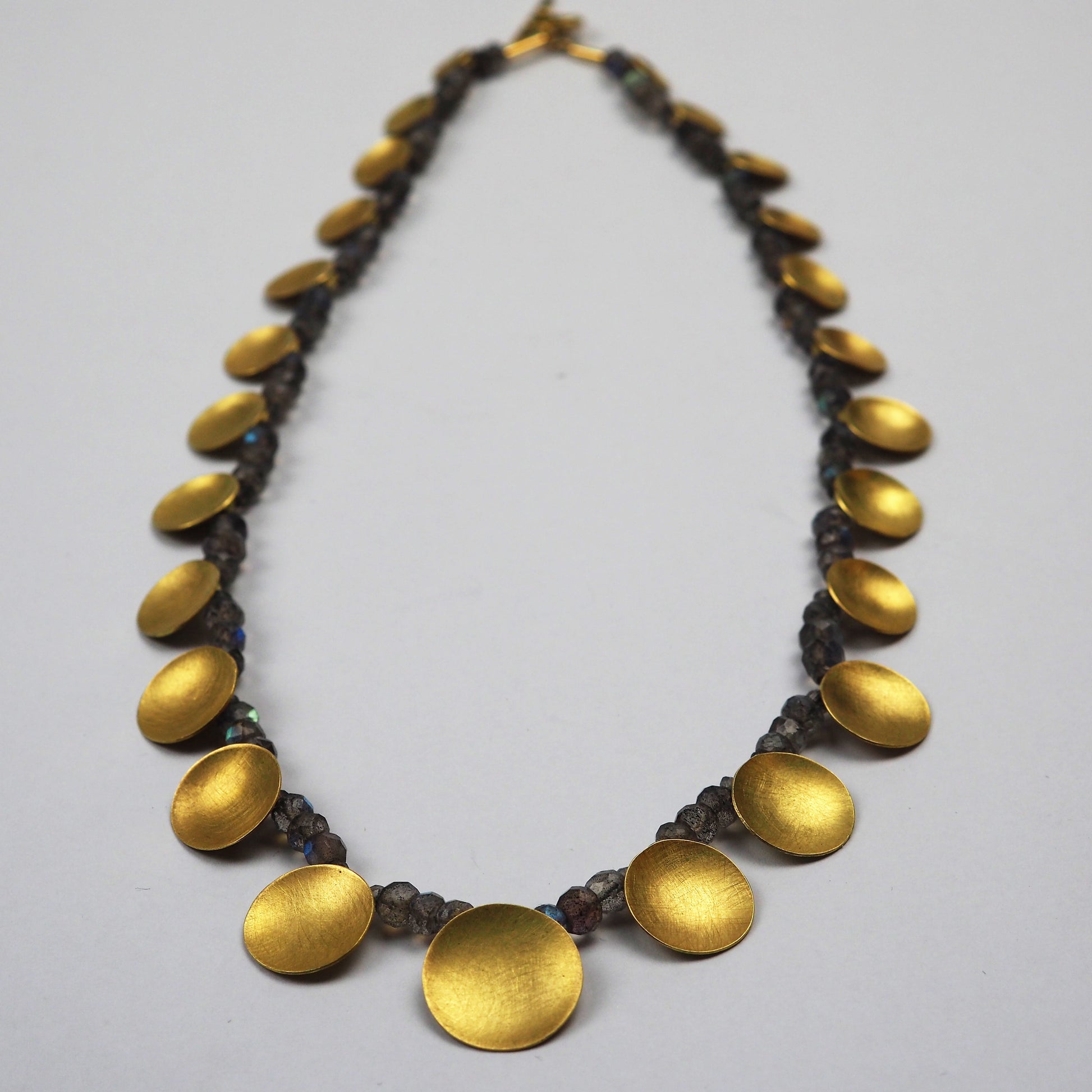 Labradorite necklace with handmade 18ct yellow gold discs and clasp by Daphne Krinos.
