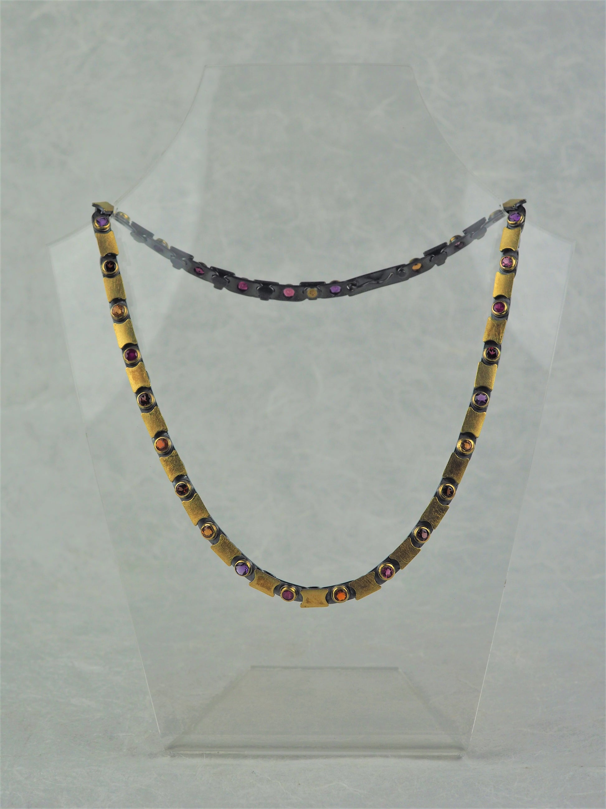 Oxidised silver and 22ct gold necklace with a selection of faceted stones by Kai Klosowski.