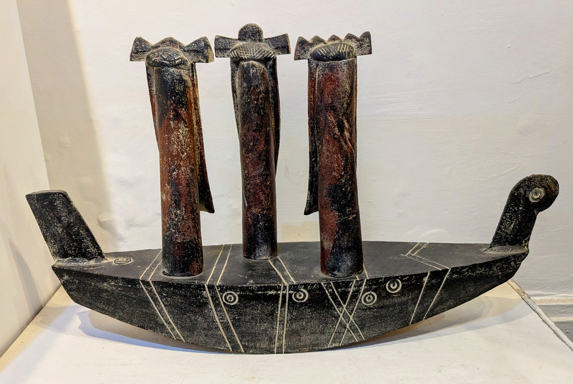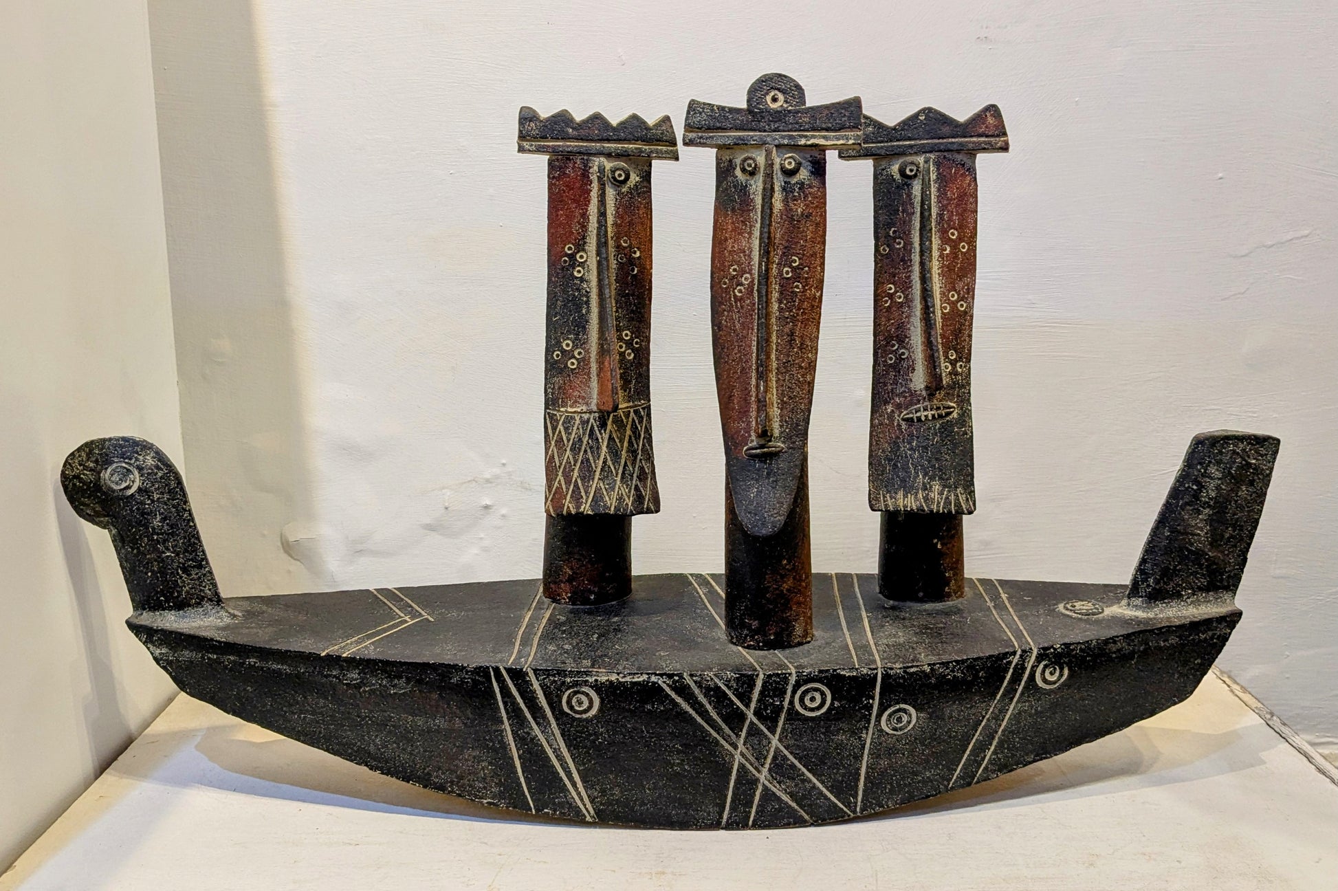 'Three Wise Men' Ceramic sculpture rocking boat with three figures by John Maltby.