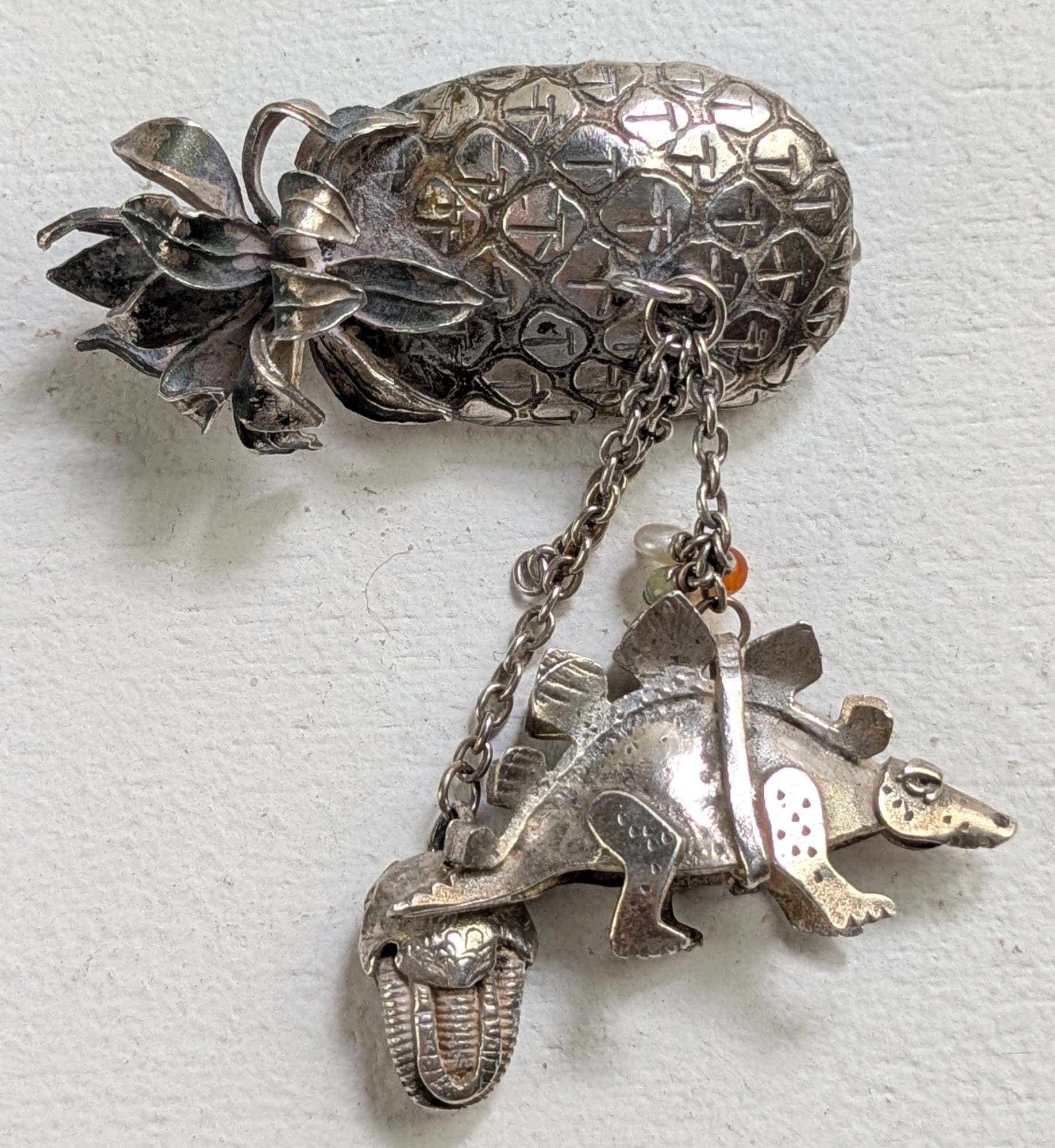 Silver Pineapple brooch, with dinosaur, acorn and bead charms.