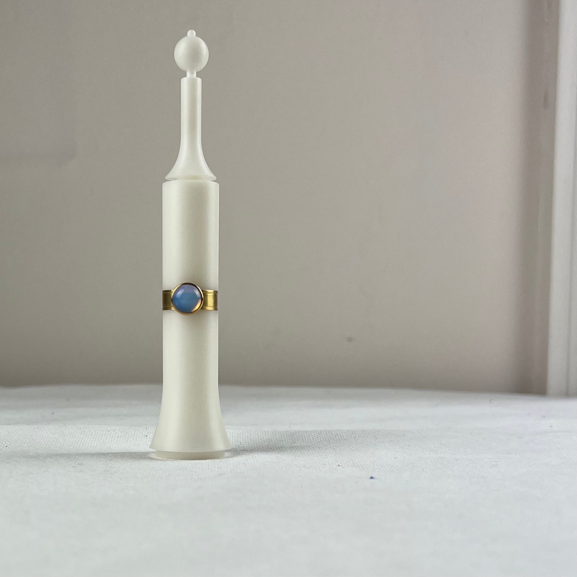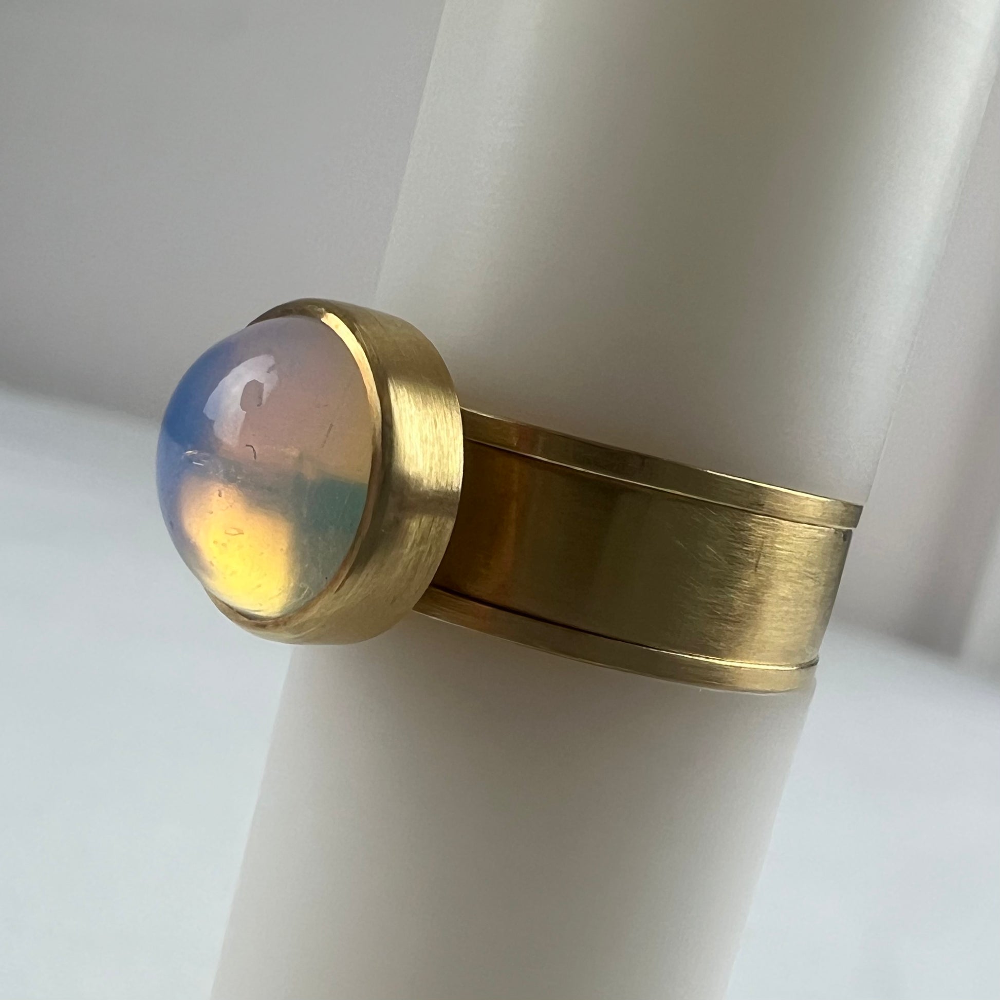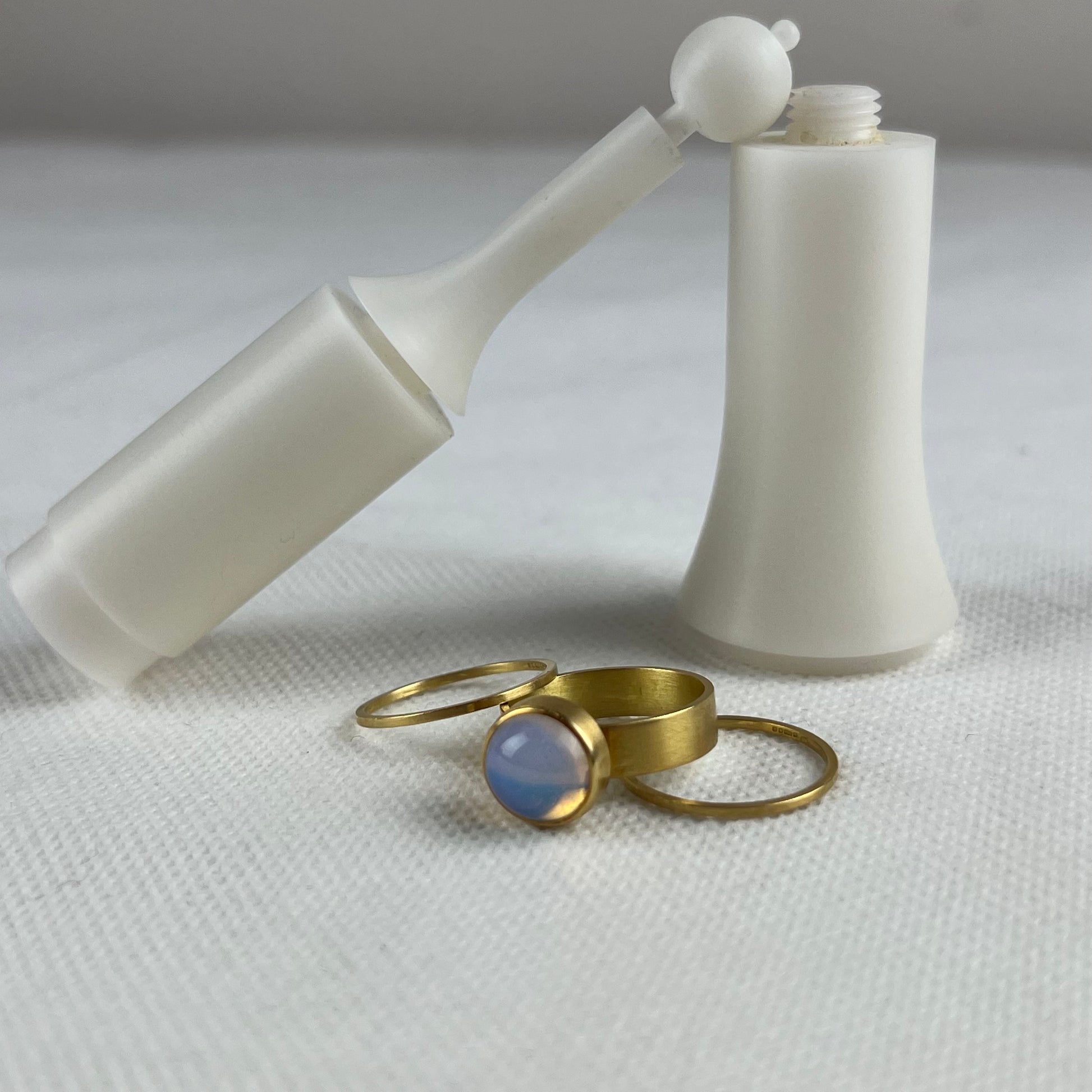 Set of three rings, 18ct yellow gold metal band with glass opal and two 18ct yellow gold bands, on a white delrin stand by Wendy Ramshaw. - 2005