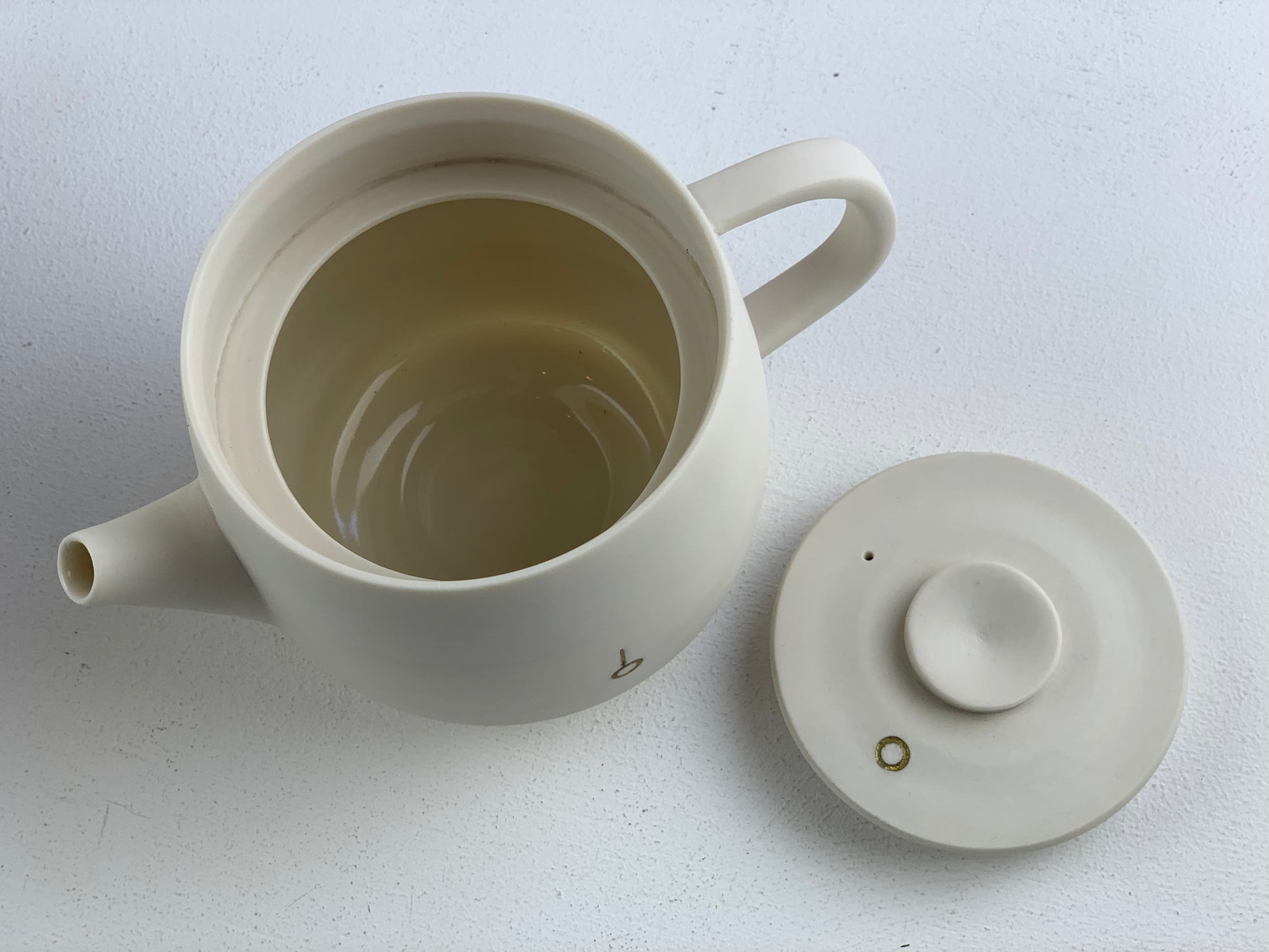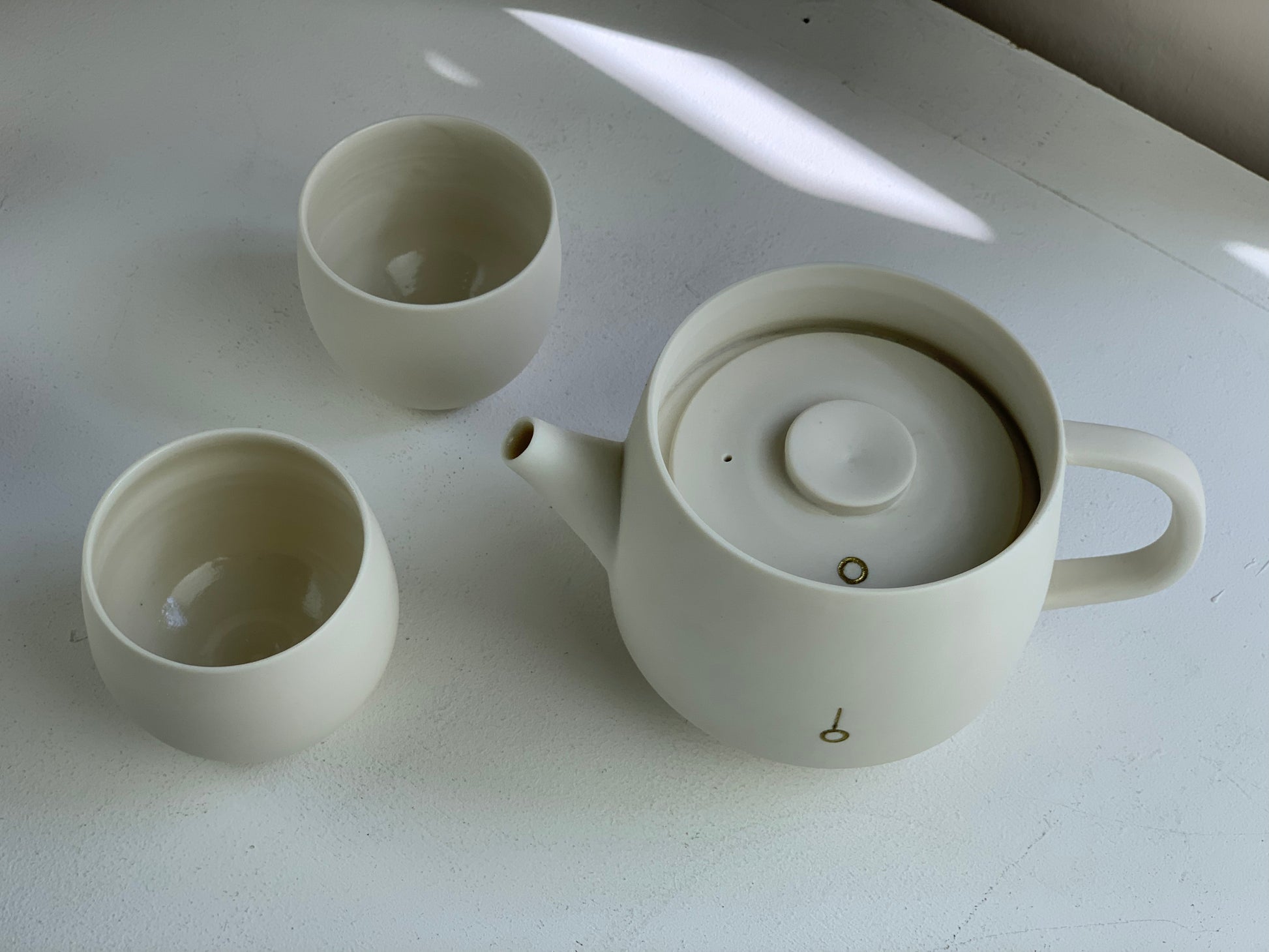 Porcelain tea set with hand thrown porcelain with gold inlay for the tea pot by Steve Cook. Transparent glaze on inside surfaces.