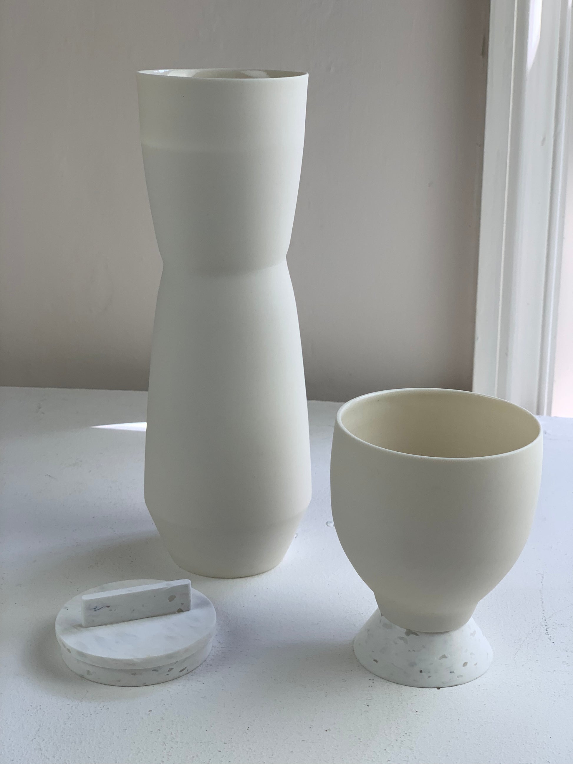 Wine carafe and glass with hand thrown porcelain, sustainable plastic and sunken lid. Transparent glaze on inside surfaces.