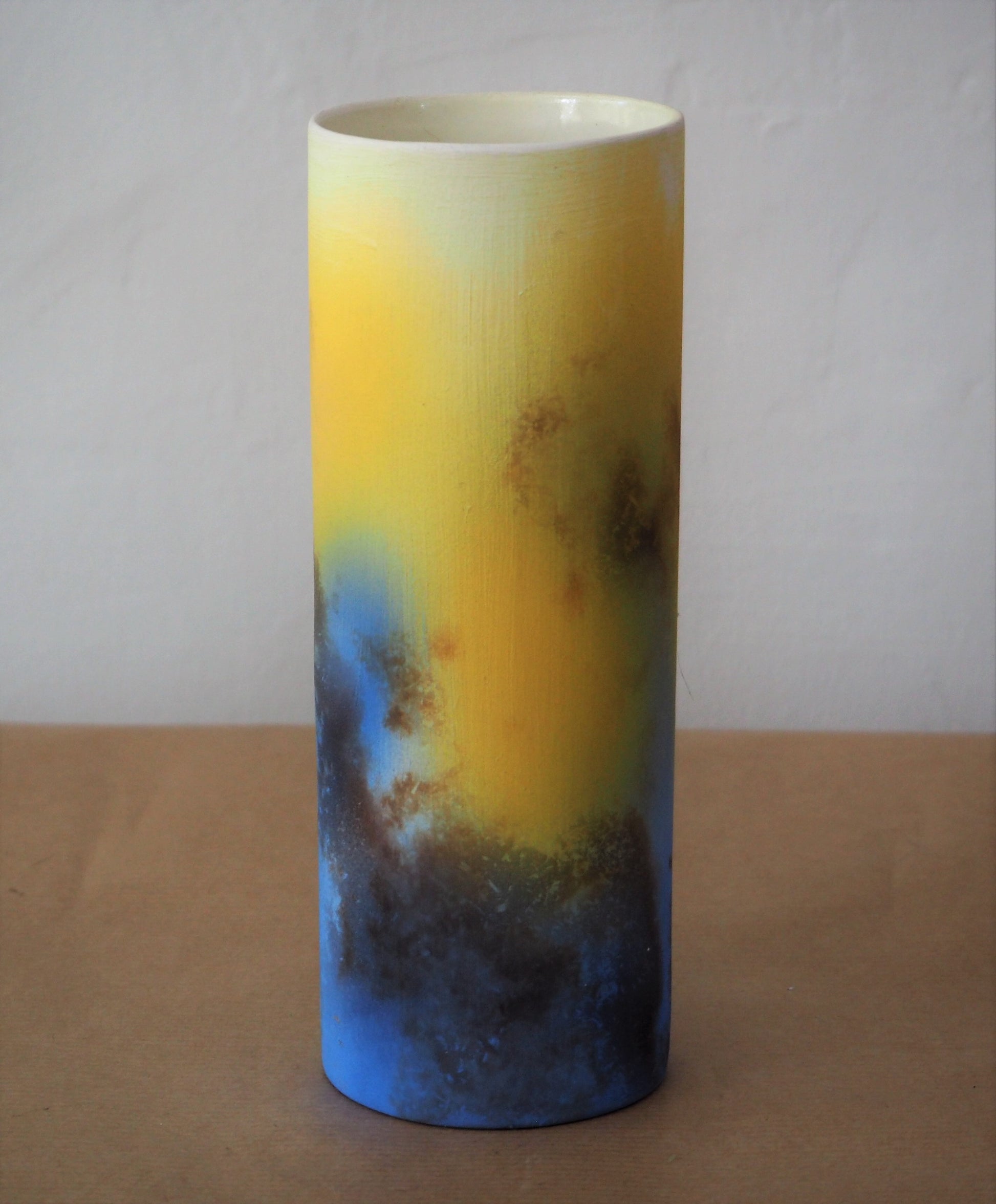 Small blue and yellow cylindrical vase by Tessa Wolfe Murray.